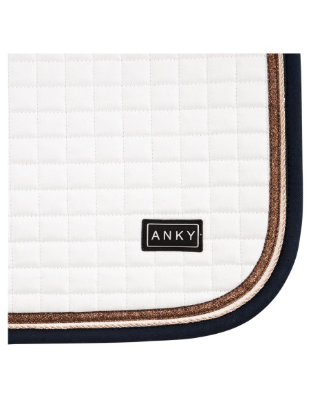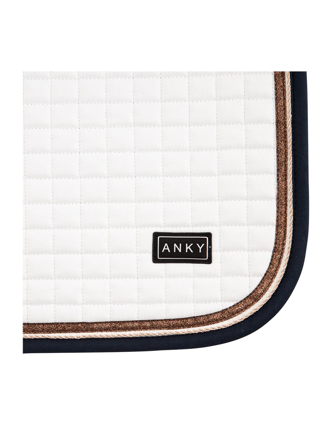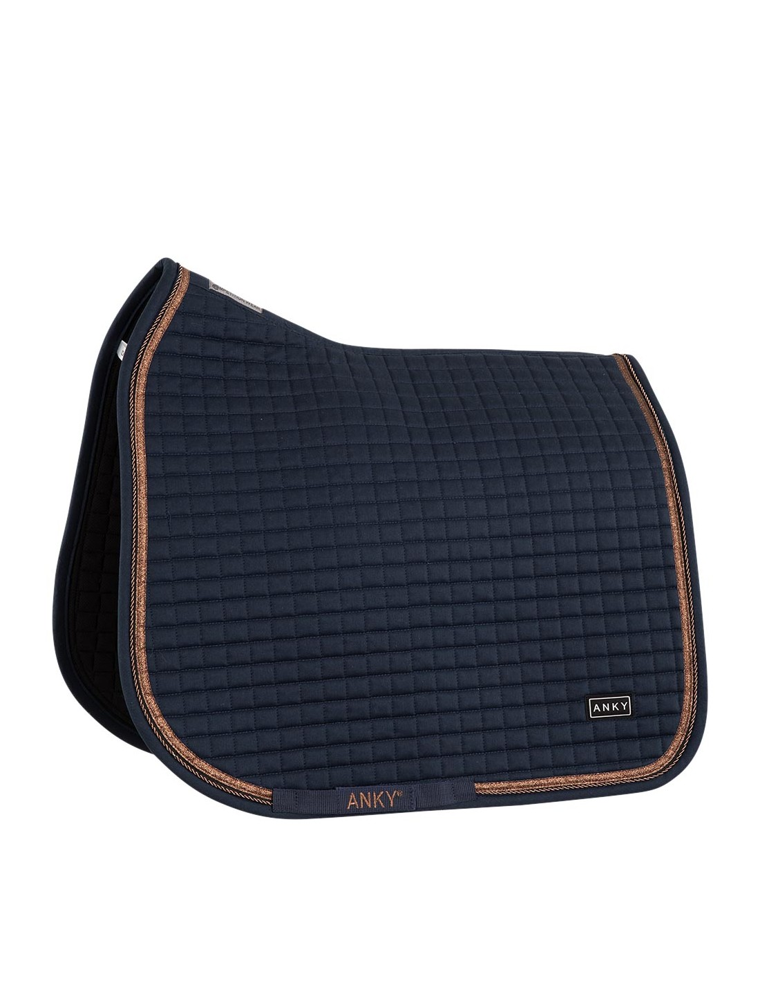 The pad has a square quilting and is finished with a copper coloured piping and a braided rose gold cord piping. Practical detail: the pad has girth loops with Velcro.