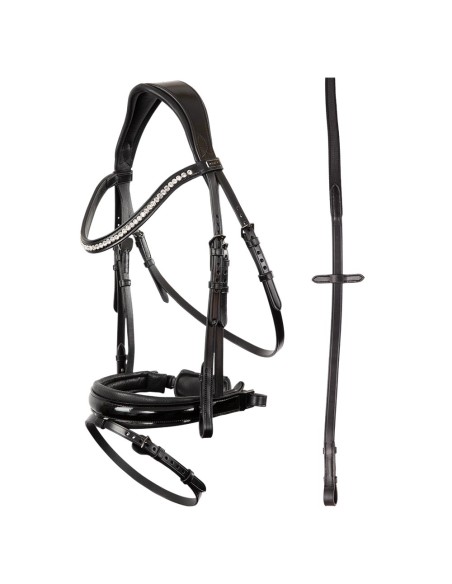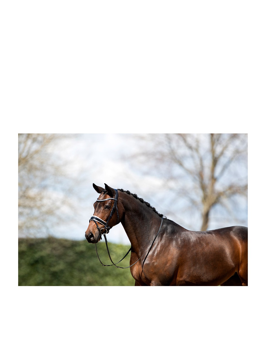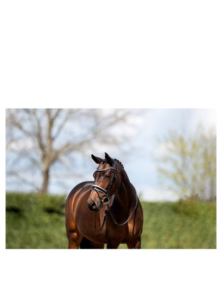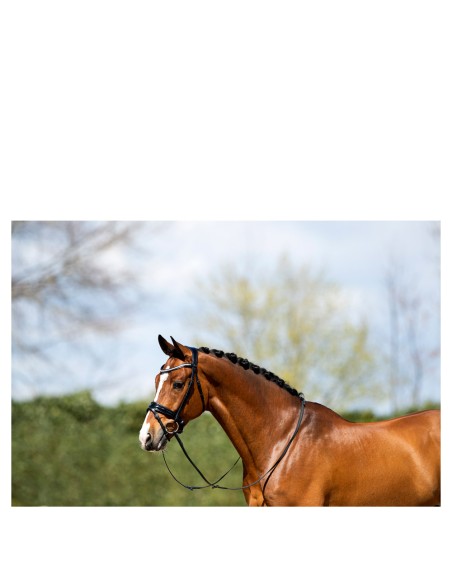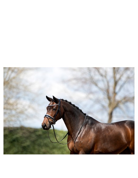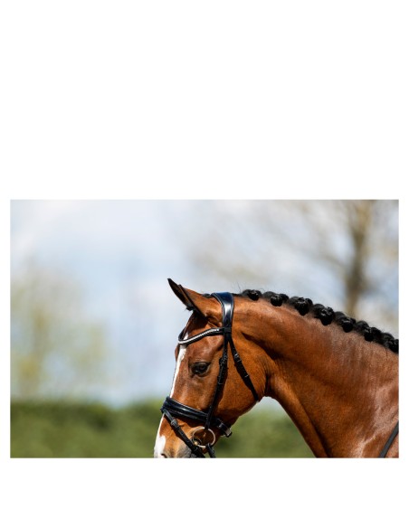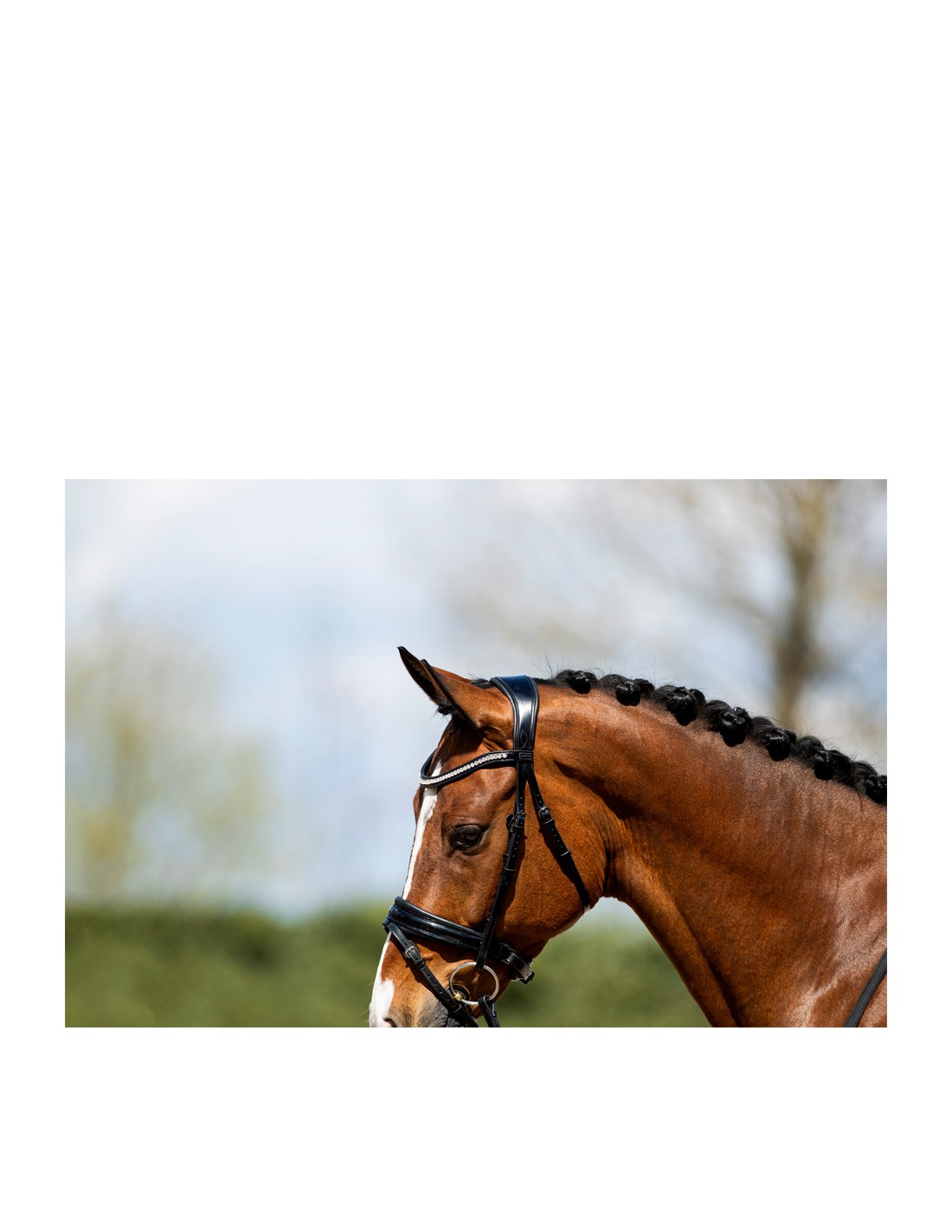 This anatomical bridle made of high quality English leather has an extra wide, softly padded headpiece and a crank noseband with extra soft padding for ideal pressure distribution. To complete the softness of the noseband, it also contains a wide, soft chin pad. The slightly curved browband is inlaid with shiny Stellux™ imitation diamonds in sturdy, silver-coloured cups. The stylish gunmetal buckles have a protective flap. The space between the adjustment holes is 1 cm.