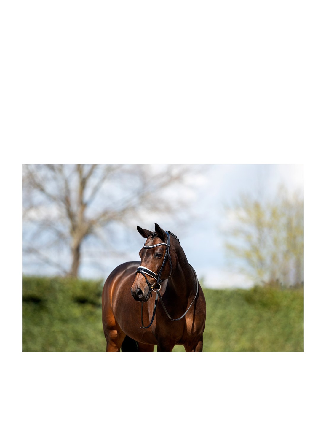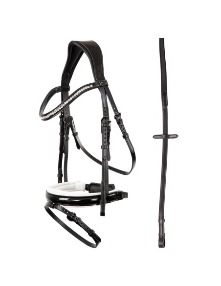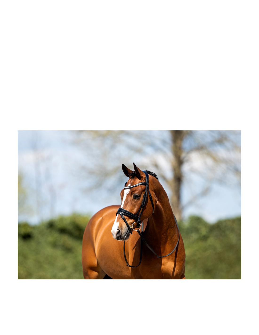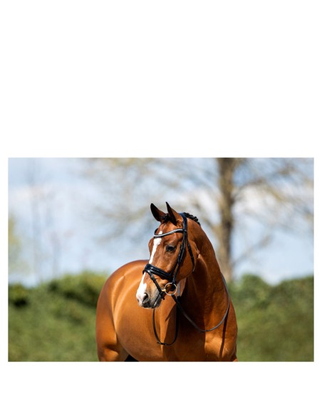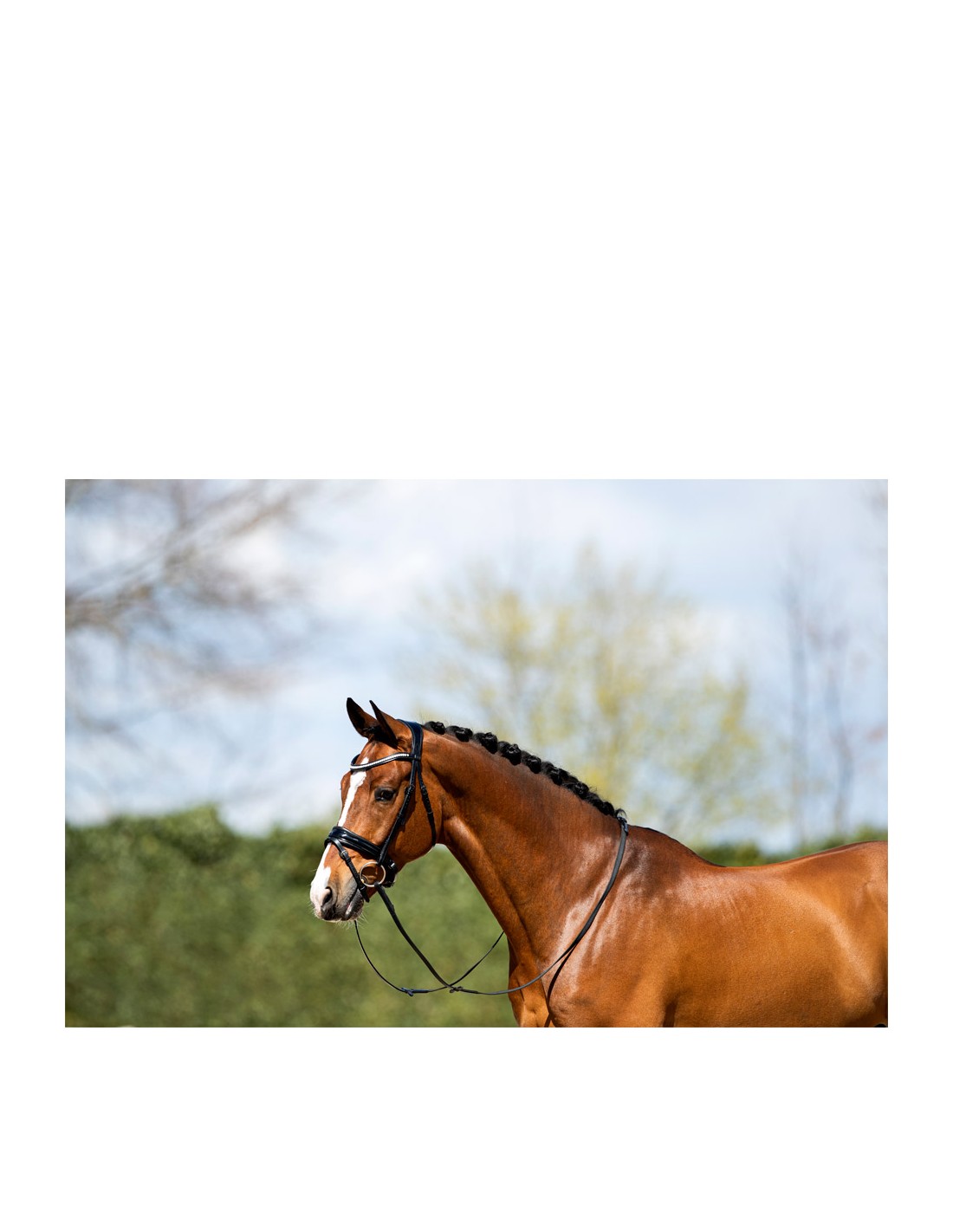 This anatomical bridle made of high quality English leather has an extra wide, softly padded headpiece and a crank noseband with extra soft padding for ideal pressure distribution. To complete the softness of the noseband, it also contains a wide, soft chin pad. The slightly curved browband is inlaid with shiny Stellux™ imitation diamonds in sturdy, silver-coloured cups. The stylish gunmetal buckles have a protective flap. The space between the adjustment holes is 1 cm.