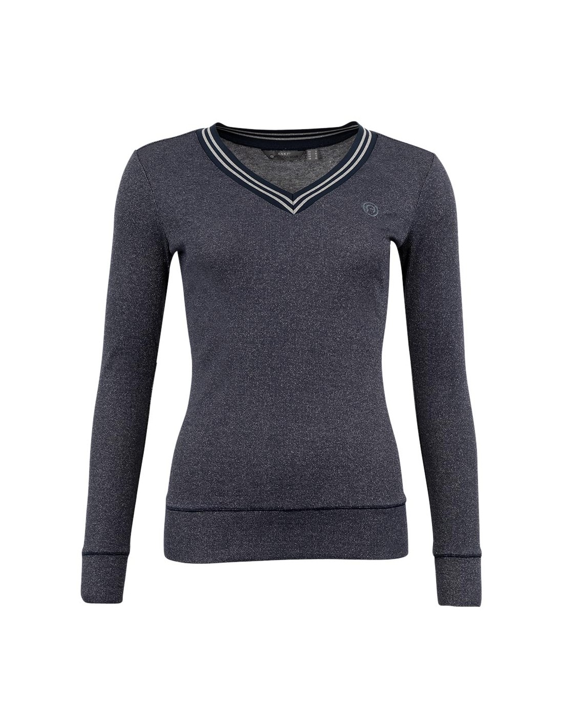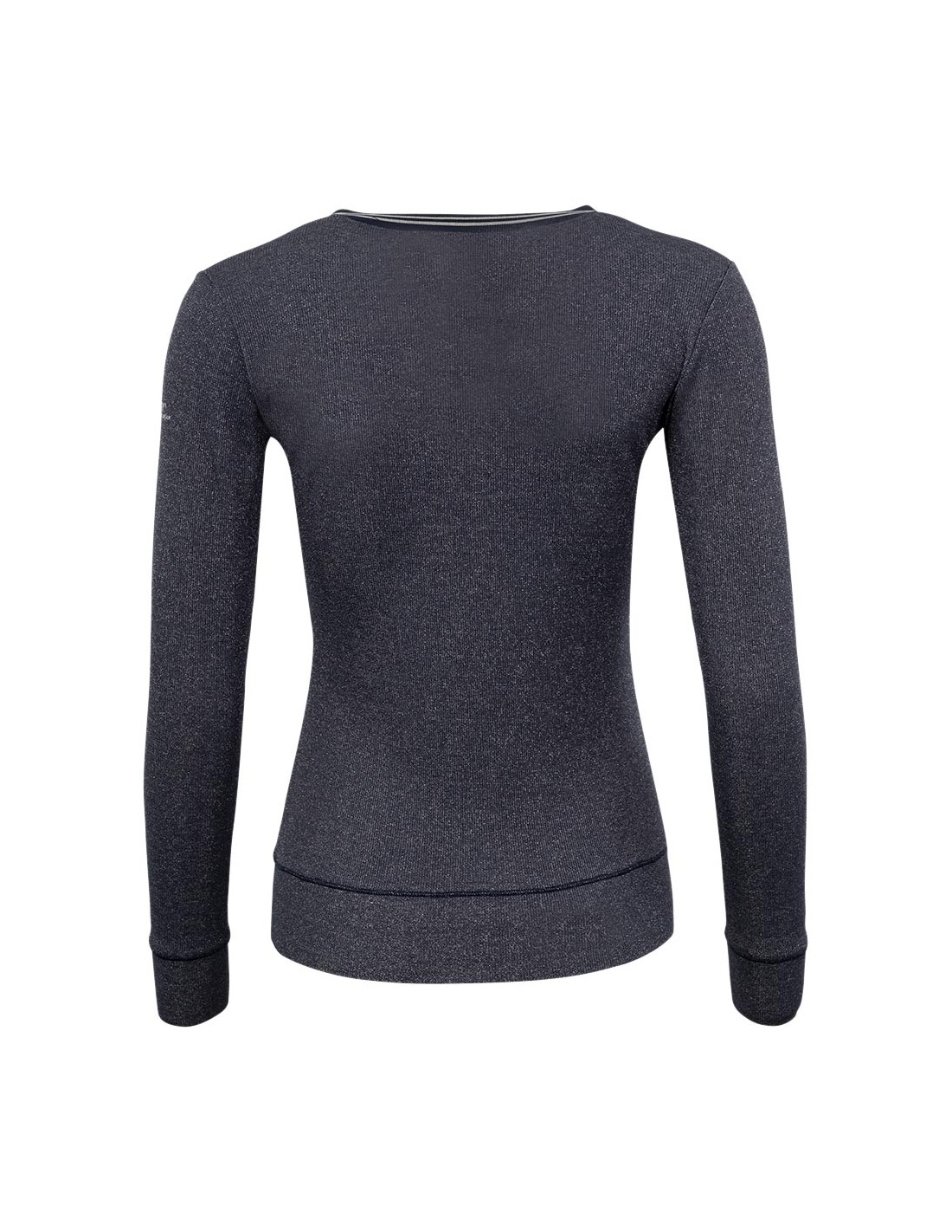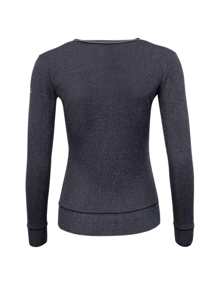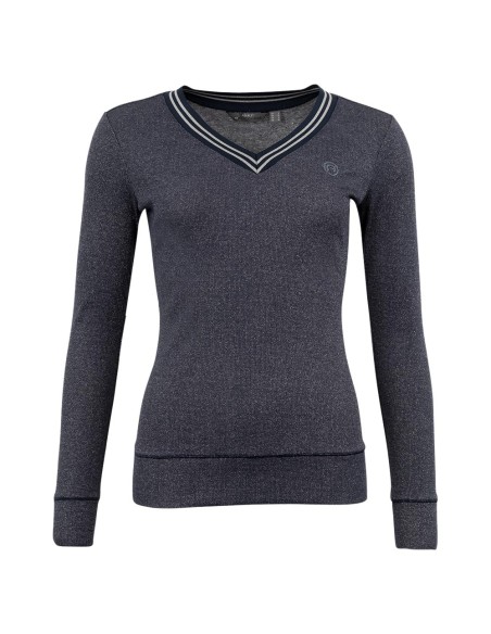 With this striking glitter pullover, you will steal the show during training and competitions in colder summer weather or mild winter weather as well! The lightweight stretch fabric is breathable, so your body heat will be wicked away for a fresh feeling. The pullover features an elegant V-neckline with a silver stripe pattern on the ribbed hem. The tailored fit and glitter print give the pullover an elegant touch.