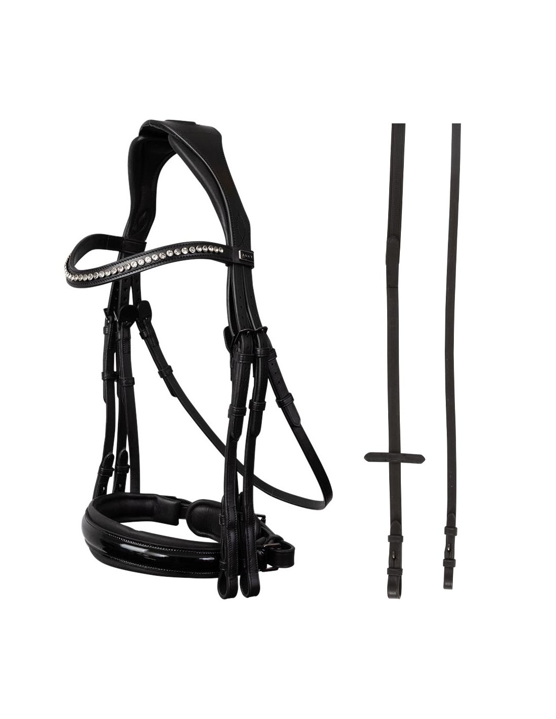 The headpiece and noseband are both softly padded for optimal comfort and good pressure distribution. The noseband contains 10 mm padding and is covered with patent leather on the outside. The gun metal-coloured buckles have a protective flap where the buckle touches the horse's head. The slightly curved browband is fashionably inlaid with shiny Stellux™ imitation diamonds in sturdy, silver-coloured cups. Includes leather and rubber reins.