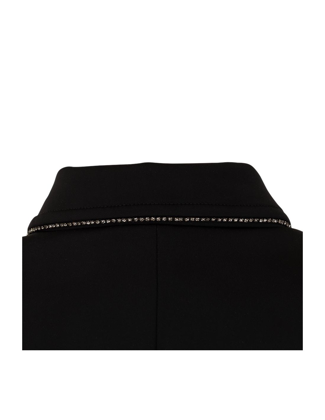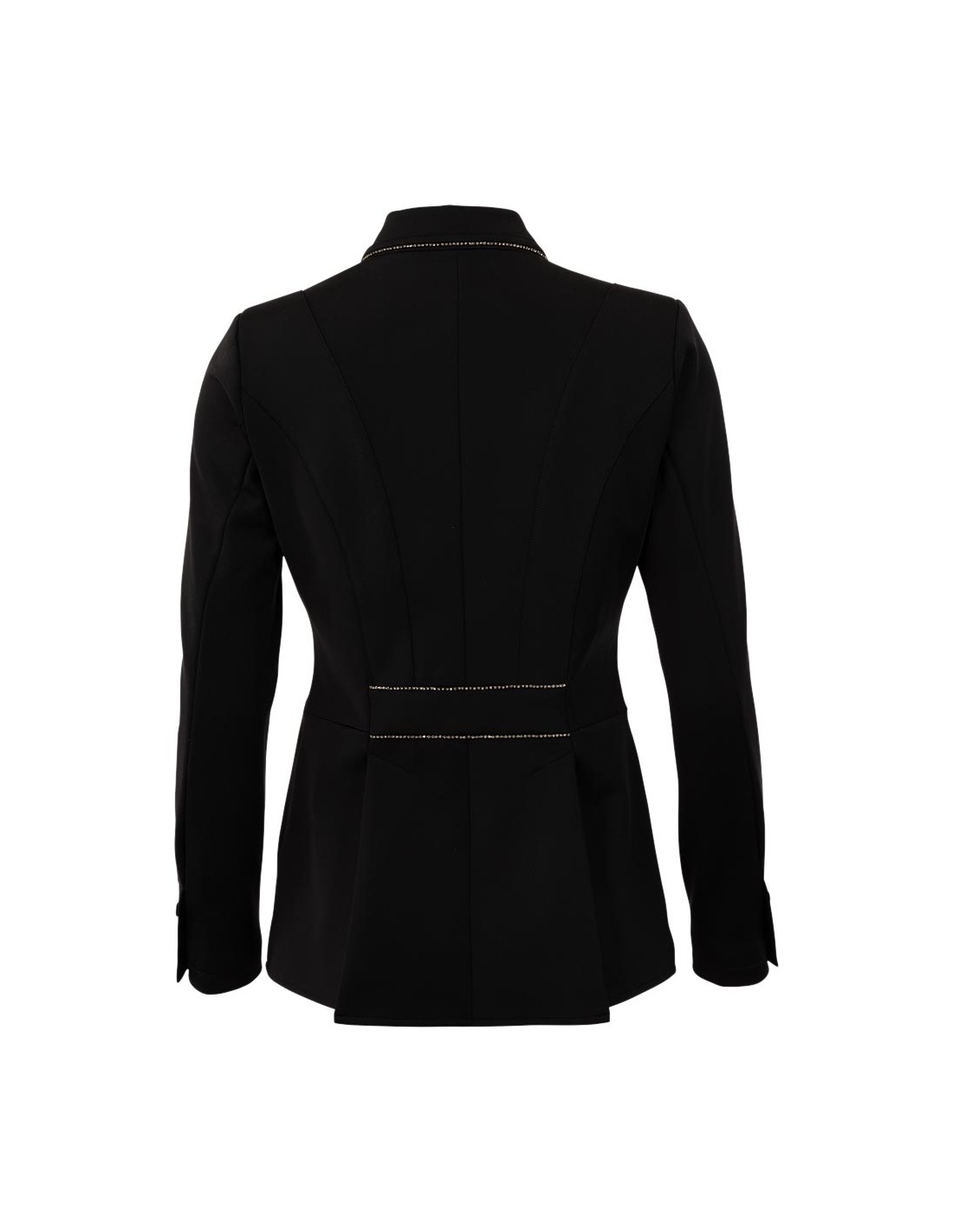 The Short Tailcoat Show is short at the front and long at the back where two splits provide optimal freedom of movement. The tailored competition jacket is stretchable, water-repellent and breathable thanks to the fabric, which consists of 85% nylon and 15% spandex bound with 100% polyester. The jacket has a black 4-way stretch mesh lining with silver glitter.