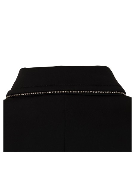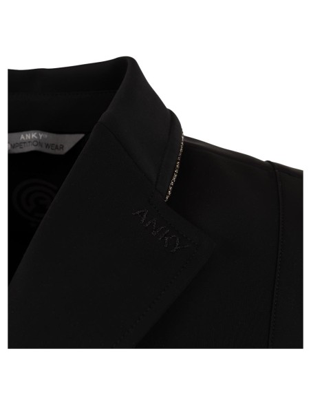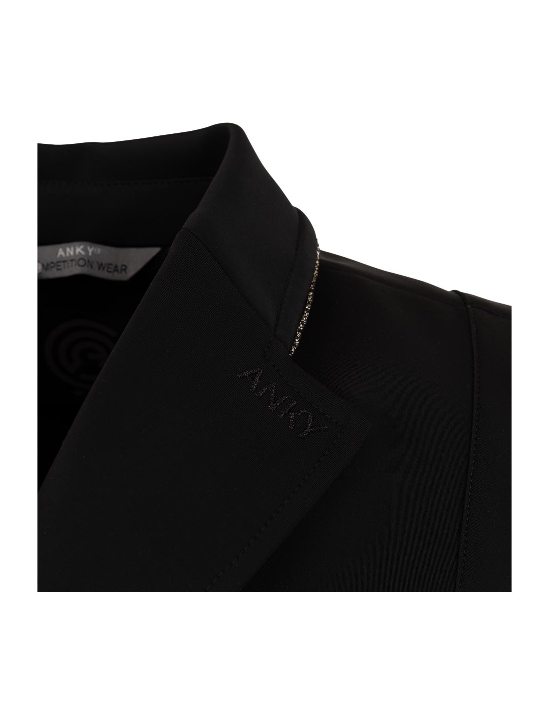 This stretchy competition jacket has a nice, snug fit and features elegant flaps that are detachable with Velcro. The flaps are finished with rhinestones The collar and the back are also luxuriously finished with rhinestones. The jacket has a double press stud closure and the press studs feature the ANKY® logo. The buttons on the sleeves also contain the logo.