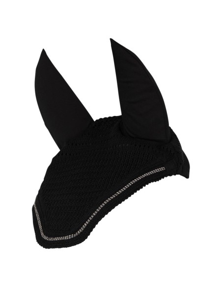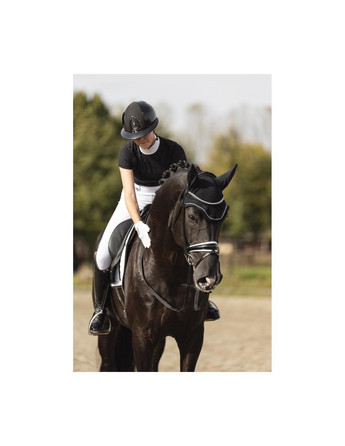 This practical ear bonnet has a subtle, chic look and gives your horse's ears optimal protection against flies and other insects. The crocheted cotton provides good ventilation. The ear bonnet is elegantly finished along the edge with two rows of small, shiny, dark rhinestones. Complete the set for your horse with the Nylon Dressage Saddle Pad Consensus, art. A16669.