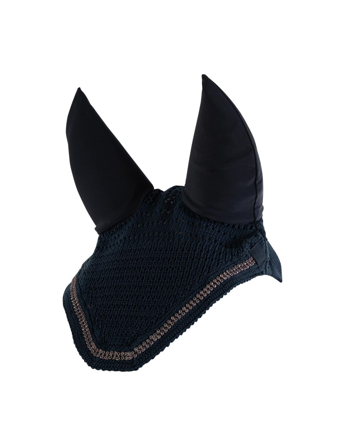 This practical ear bonnet has a subtle, chic look and gives your horse's ears optimal protection against flies and other insects. The crocheted cotton provides good ventilation. The ear bonnet is elegantly finished along the edge with two rows of small, shiny, dark rhinestones. Complete the set for your horse with the Nylon Dressage Saddle Pad Consensus, art. A16669.