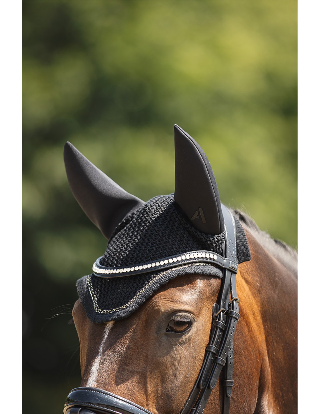 This practical ear bonnet offers a subtle, chic look and provides optimal protection against flies and other insects. The crocheted part ensures good ventilation. The ear bonnet is elegantly finished along the edge with a gold/black braided trim. Complete the look with the ANKY® Dressage Pad Presence XB25005, article A16684.