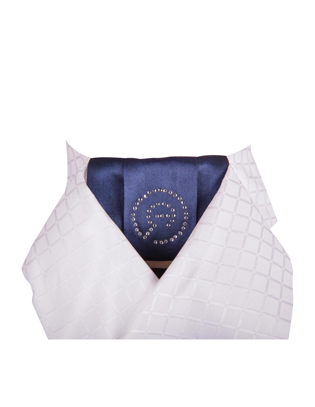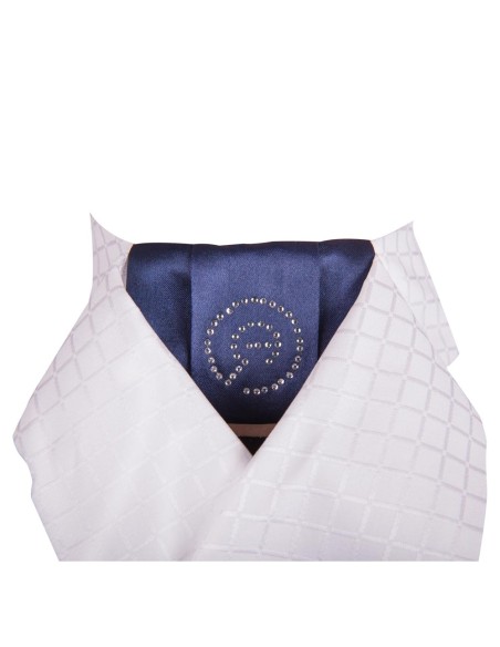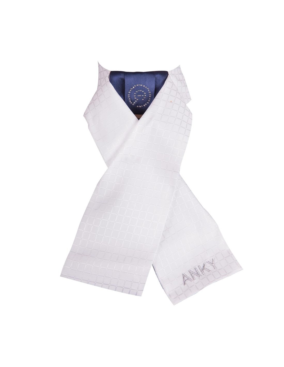De ANKY® Delux plastron is een voorgevormde plastron met in het midden een contrasterend deel in Navy, ook beschikbaar in geheel wit. Voorzien van het ANKY® logo van strass steentjes. Doormiddel van een plastronspeld kunt u de plastron op de klassieke manier dragen. Wordt geleverd met een waszak.