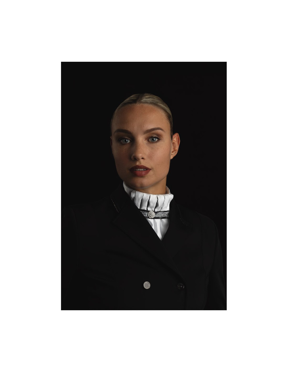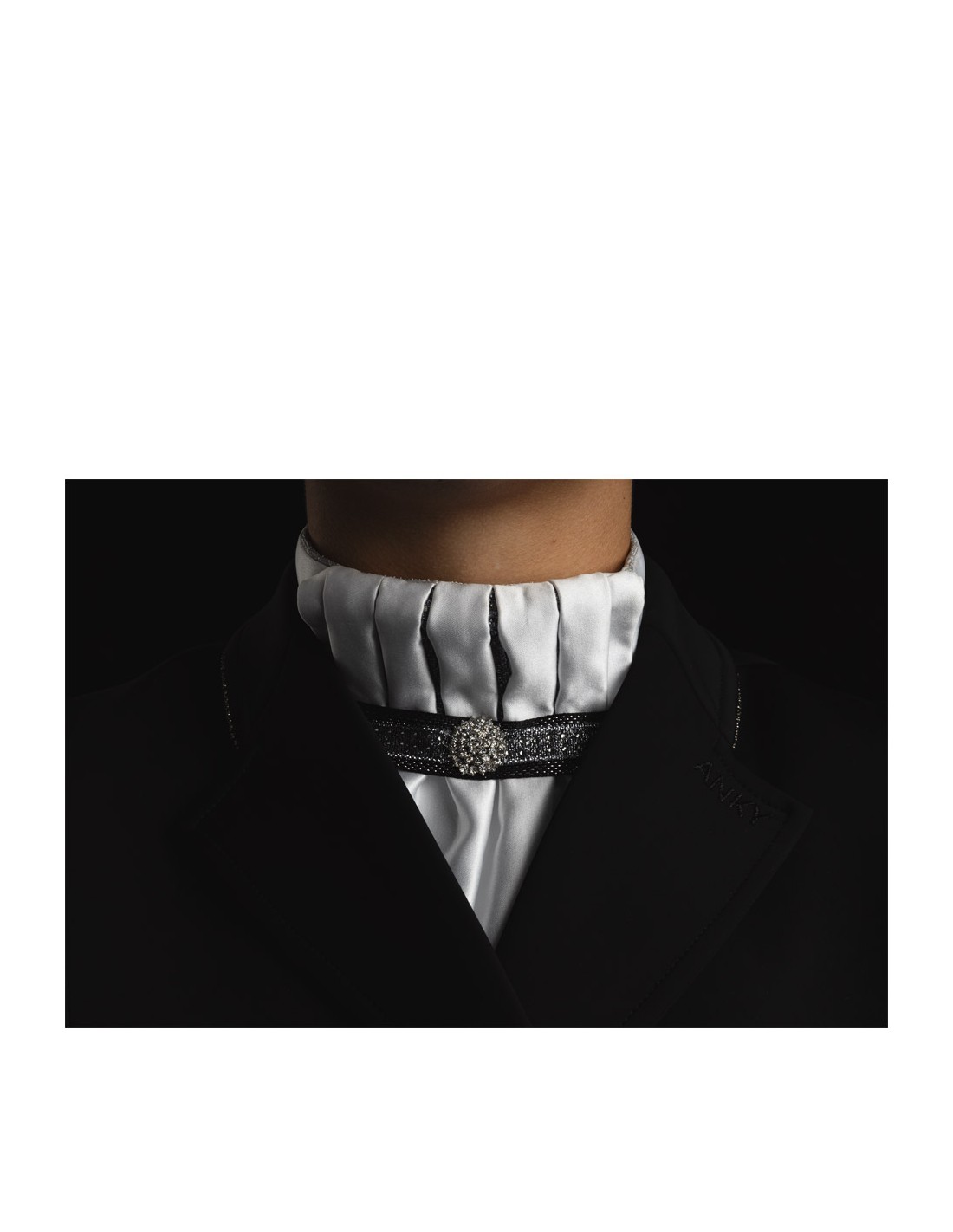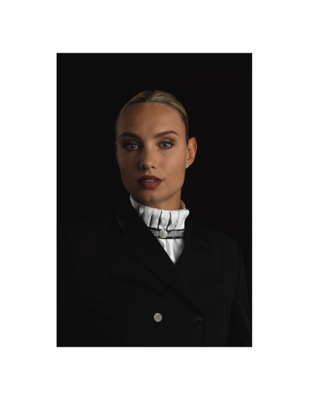 Met de Pleated Crown plastron maakt je jouw wedstrijd outfit helemaal af! De plastron is voorzien van afneembare broche, contrasterende ribbon en een zilveren piping voor een chique uitstraling. Wordt geleverd met waszak.