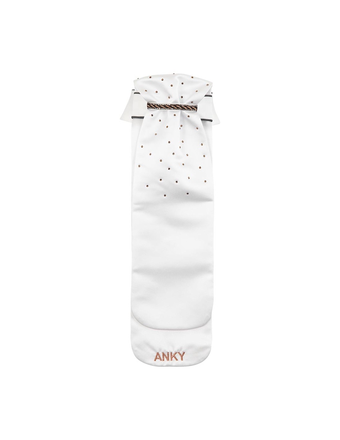 De plastron is gedecoreerd met een band met strass steentjes, die gebruikt kan worden om de flap erdoor te halen voor een ‘pof’-effect. Deze plastron ontvang je inclusief bijbehorende kragen, een waszak en een informatieblad met de draagmogelijkheden.