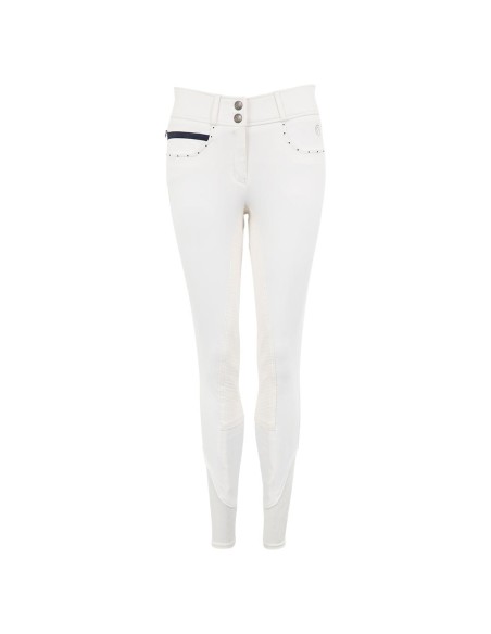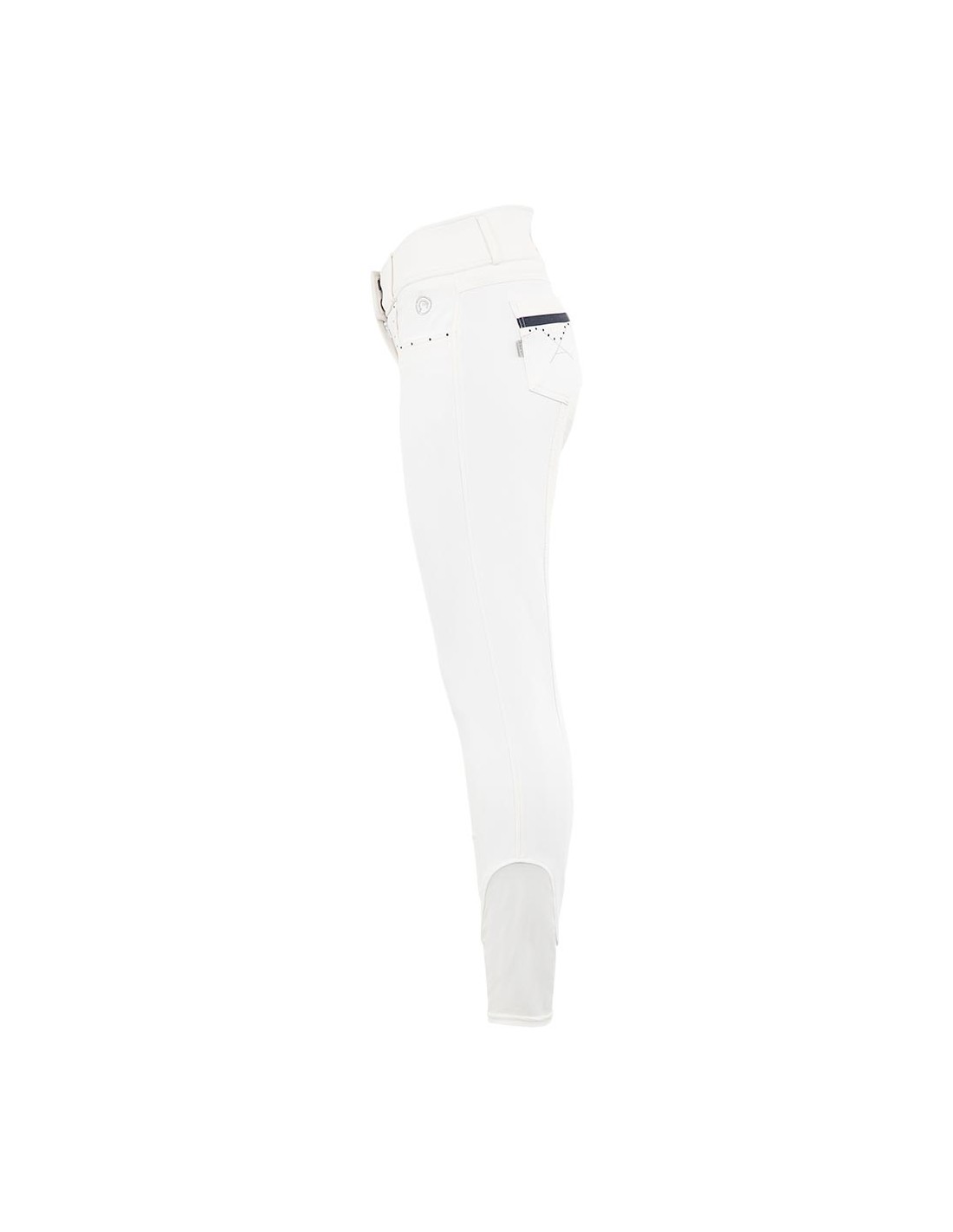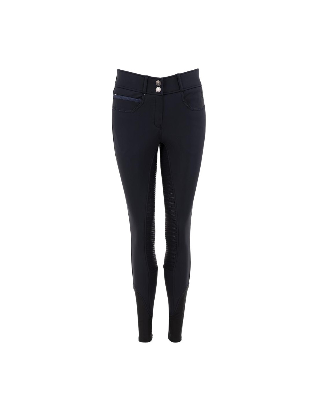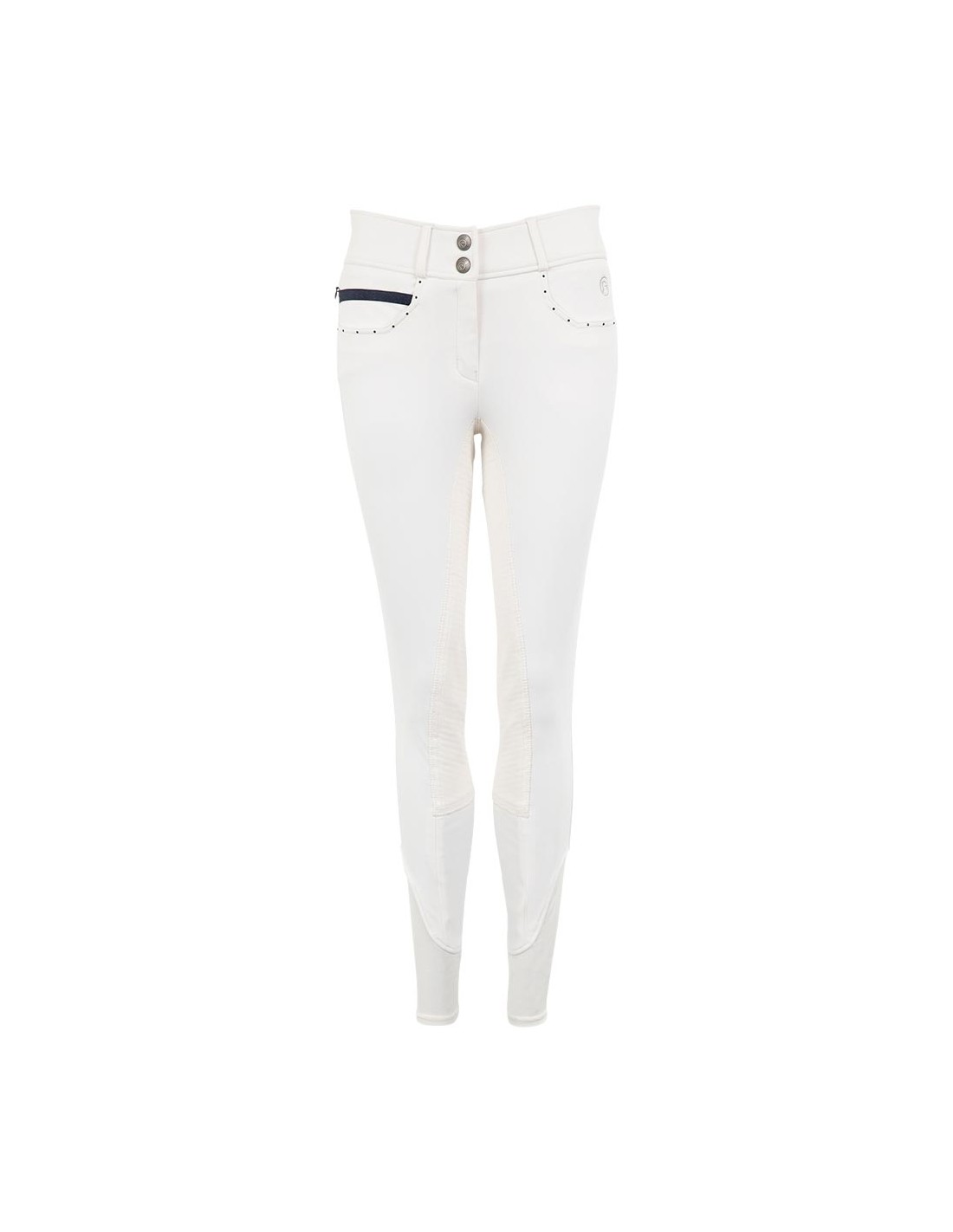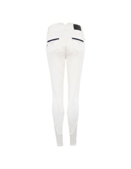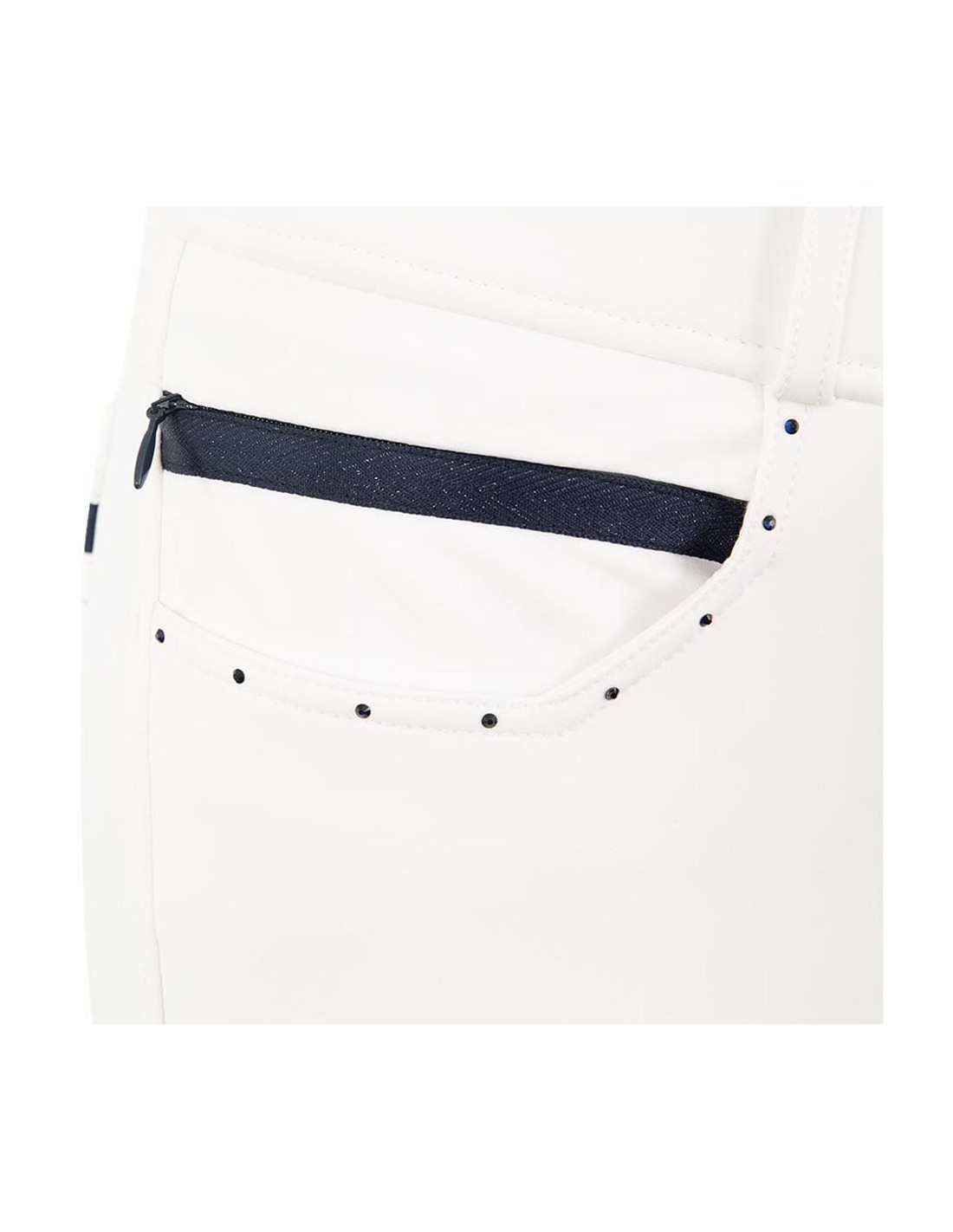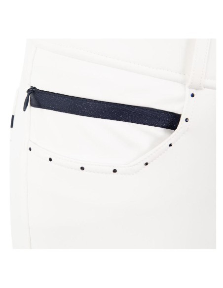 De Stone Taped rijbroek met siliconen zitvlak heeft een chic voorkomen met blauw gekleurde strass steentjes op de voor- en achterzakken. Aan de rechter voorzijde bevindt zich een kleine zak met blinde rits bedekt door blauw sierband. Verder is de rijbroek voorzien van twee haak- en oog voorsluitingen en het zilveren geborduurde ANKY®-logo aan de voorkant.