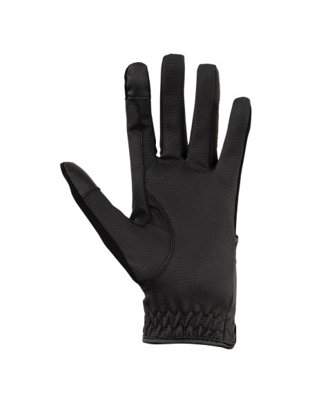 Deze technische ANKY® handschoenen zijn gemaakt van ademend meshmateriaal en stijlvol bedrukt synthetisch leder. Het elastische mesh en het elastiek om de pols zorgen voor een goede pasvorm en de teugelversterking zorgt voor meer grip op de teugels. Het touchscreenmateriaal op de duim en wijsvinger en de afwerking met glittermateriaal maken van deze handschoen een mooie eyecatcher tijdens een wedstrijd.