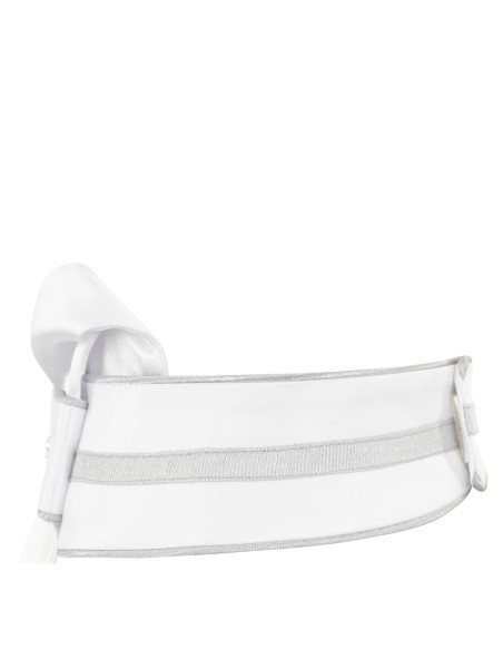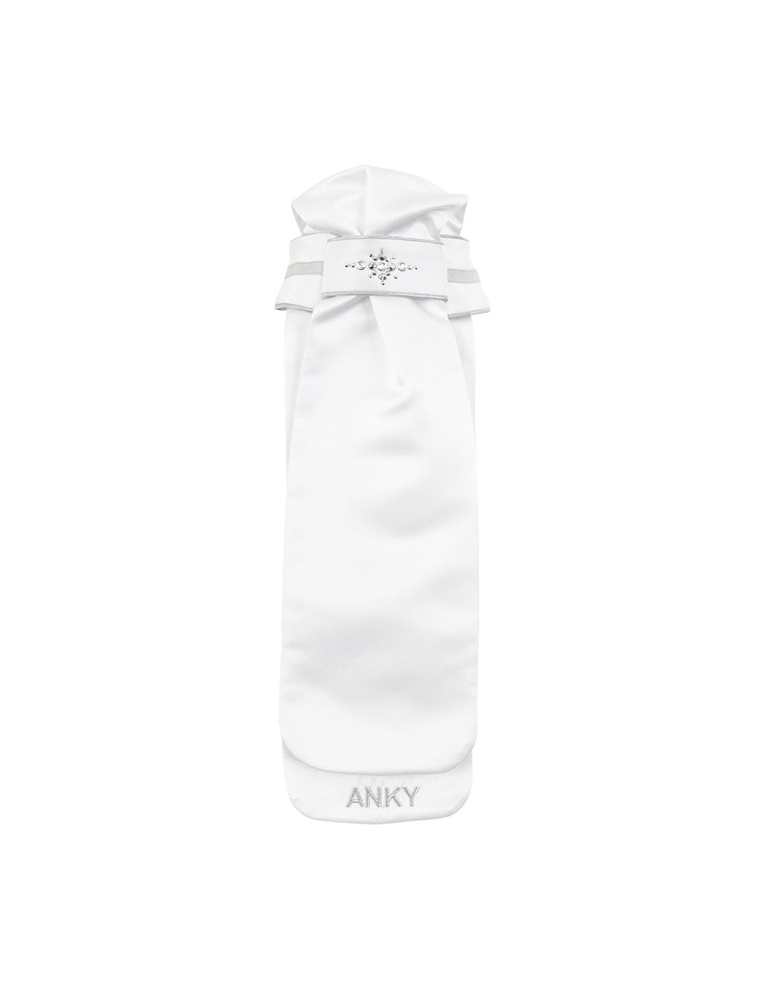 Deze luxe plastron met geplooid model is afgewerkt met contrastbiezen in het zwart, navy of zilver. Op het voorstuk bevindt zich een sierlijk patroon van strass steentjes in verschillende groottes, matchend met de kleur van de contrastbiezen. De kraag is voorzien van een glanzende contrastbies en op de onderzijde van de plastron is het zilveren, geborduurde logo te vinden. Wordt geleverd met waszak.