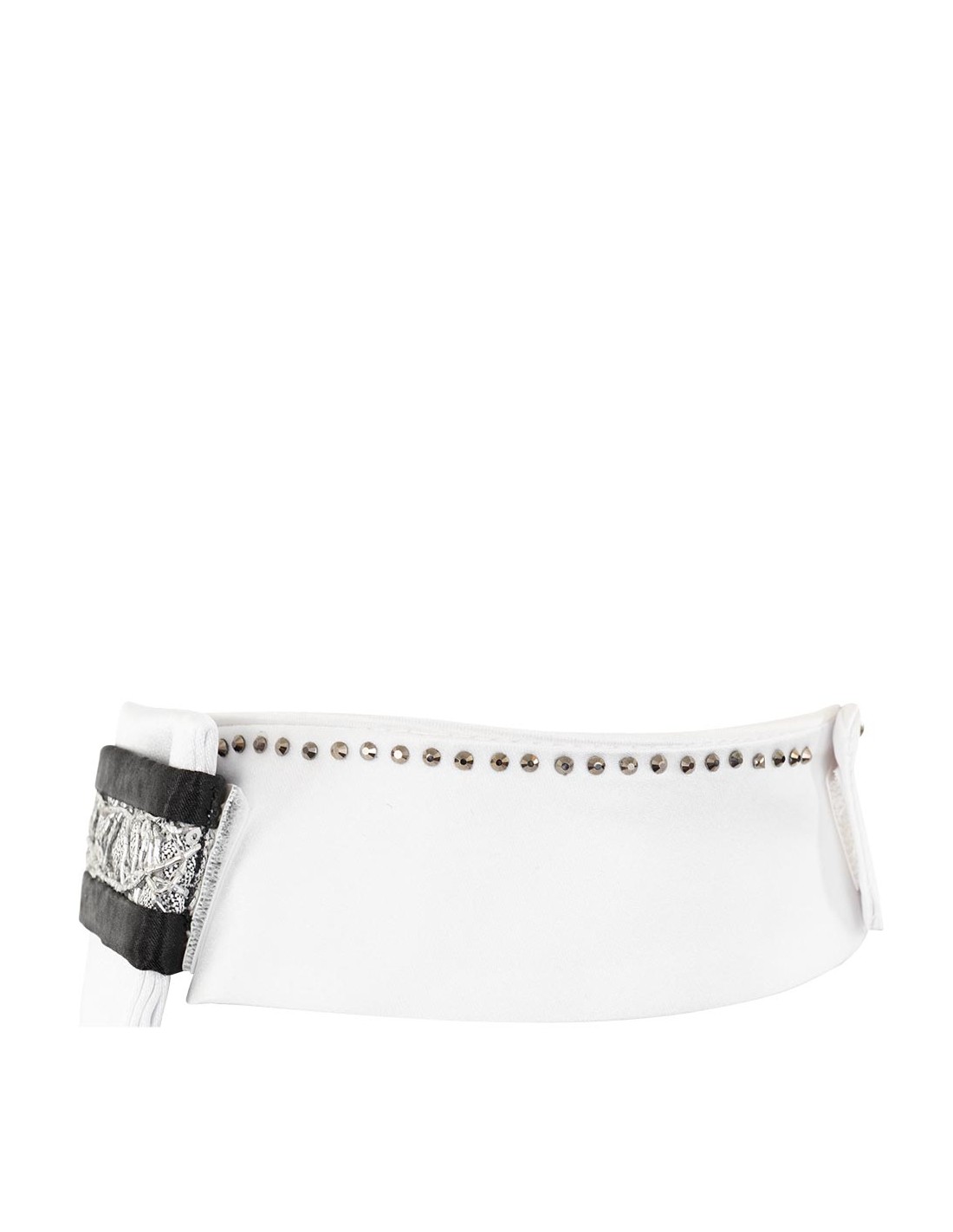 De plastron Variable wordt geleverd met een extra kraag zodat je de kraag eenvoudig kunt afstemmen op je look. De ene kraag is afgewerkt met gekleurde strass steentjes en de andere kraag is subtiel afgewerkt met een contrastbies. Op de voorkant bevindt zich glanzende, zilveren stof met een patroontje van kleine pailletten.