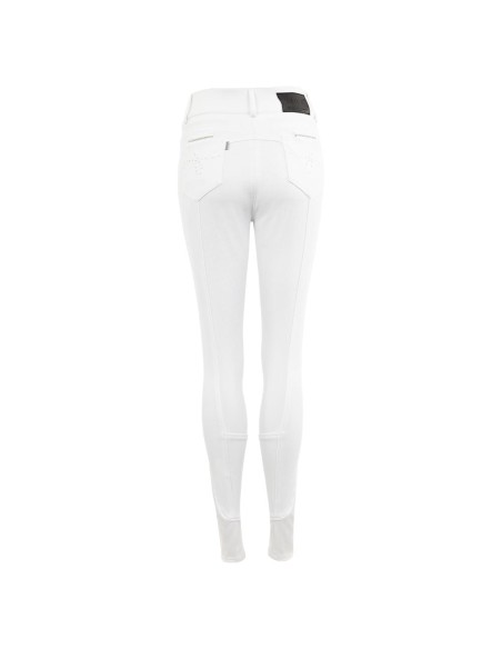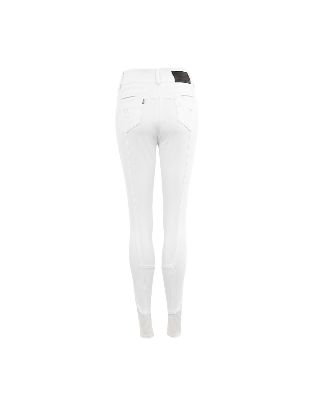 Deze mooie, stevige rijbroek beschikt over diepe steekzakken en een muntzakje met nylon rits aan de voorzijde en vier opgestikte zakken (twee grote en twee kleine) aan de achterzijde. De zakken zijn gedecoreerd met glanzende, gevlochten tape en een patroon van zilveren strass steentjes.