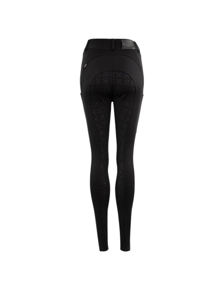 De rijbroek Prime beschikt over een handige haak-oogsluiting en diepe zijzakken geschikt voor je mobiele telefoon afgewerkt met donkerkleurige, glanzende, elastische tape. De matte siliconenprint op het zitvlak zorgt voor extra grip en een stabiele zit. De metalen knopen en het metalen logo op de riemlus maken de broek op elegante wijze af.