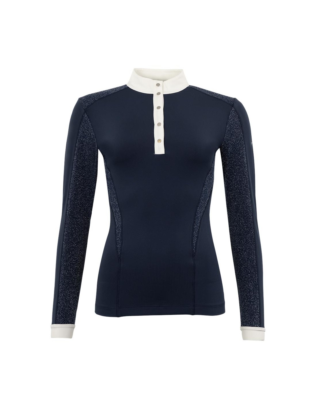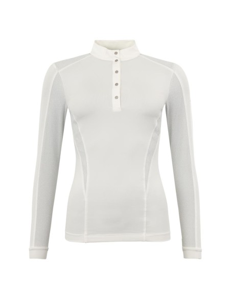 Het lichtgewicht Longsleeve Shirt Olympia blinkt uit door de soepele, 4-way stretchstof en de glanzende meshstof afgewerkt met gevormde naden. Ook het logo gemaakt van strass steentjes op het achterpand is een eyecatcher. Het shirt is aan de voorzijde voorzien van een witte knoopsluiting met gladde, zilveren knopen.