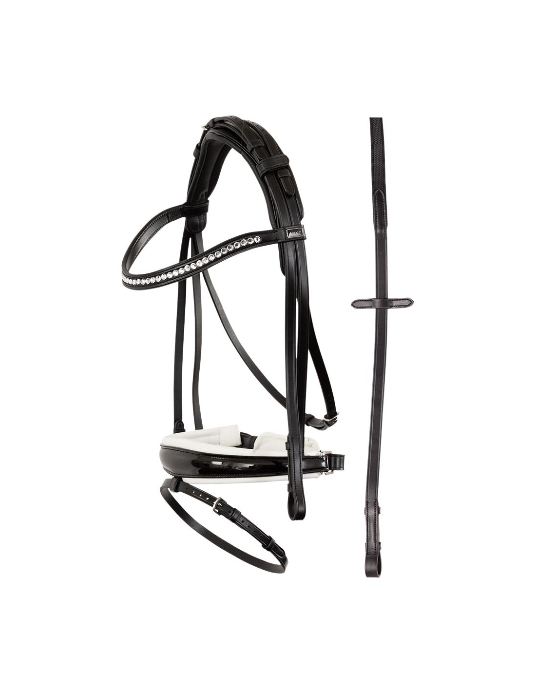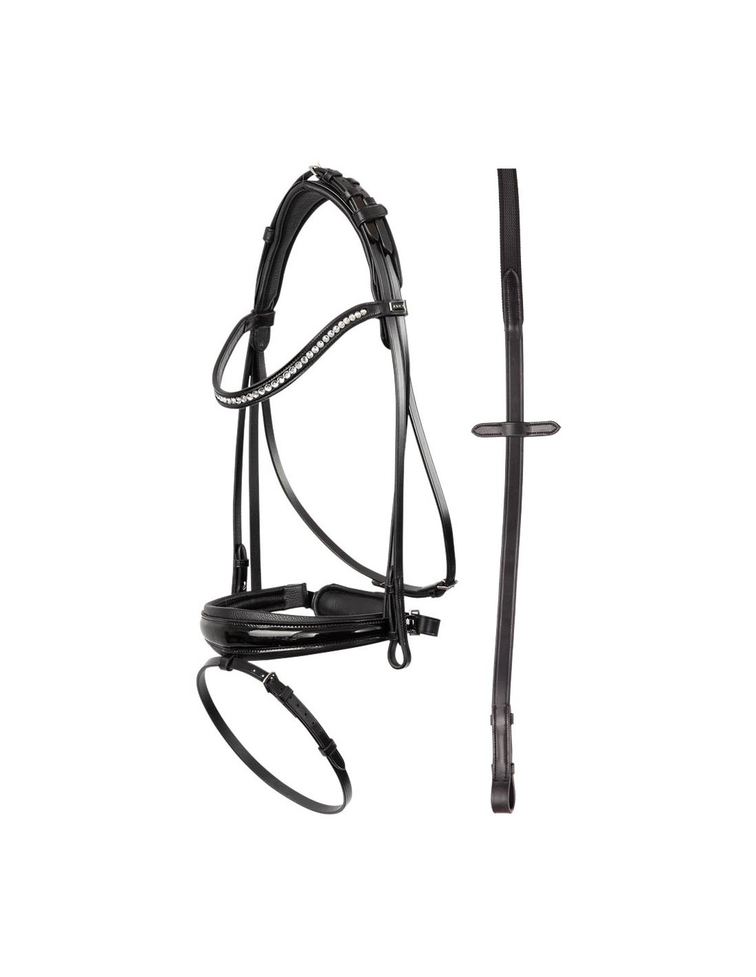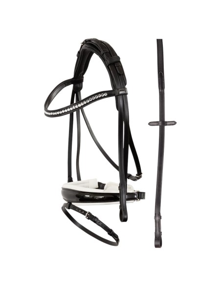 Dit mooie anatomische hoofdstel valt op door de hoge mate van comfort en de luxe elementen zoals het lakleder en de glanzende imitatiediamanten. De gespen bevinden zich bij dit hoofdstel boven op het kopstuk en de bakstukken zijn voorzien van blinde gespen.