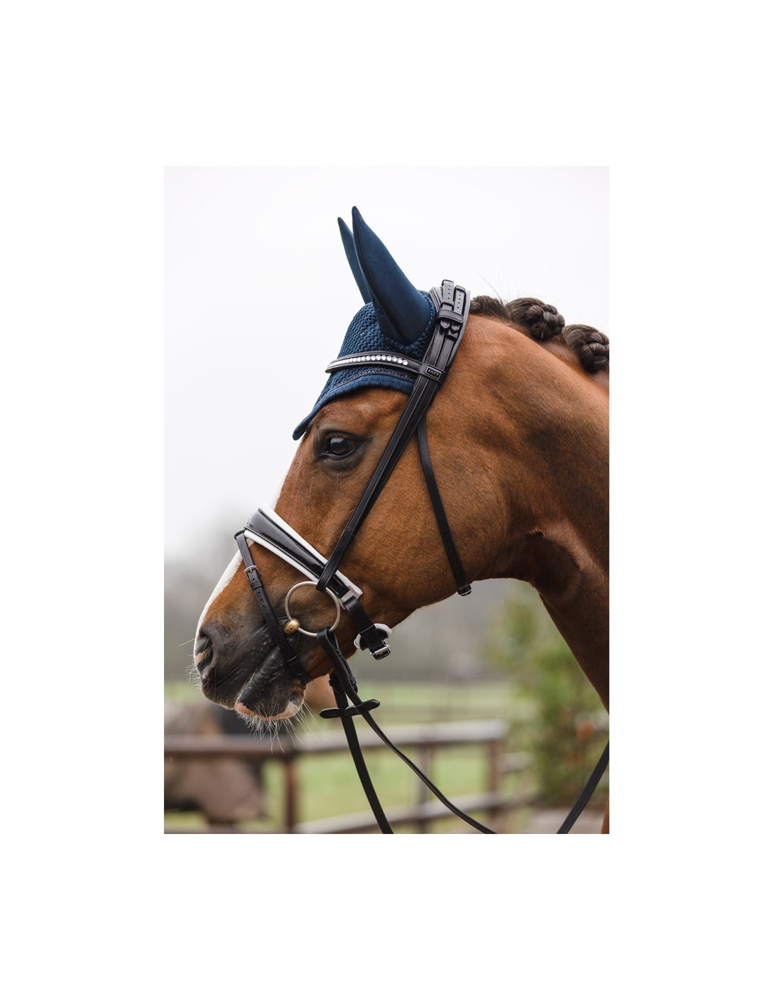Het hoofdstel is gemaakt van Engels leder van hoge kwaliteit dat zeer soepel is en lang mooi blijft. Ook de gespen zijn stevig en van goede kwaliteit. De neusriem is chique afgewerkt met lakleder en op het kopstuk bevindt zich een subtiele bies van lakleder. Het frondeel trekt de aandacht dankzij de imitatiediamanten van Stellux™ die stevig ingelegd zijn. Kortom: een hoofdstel met heerlijk zachte onderdelen waarmee je paard stralend op wedstrijd verschijnt.