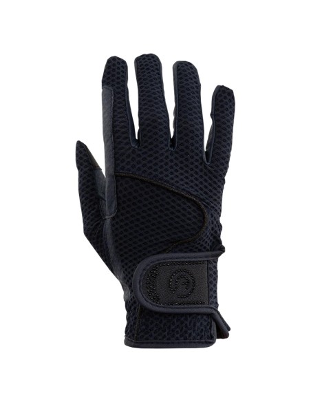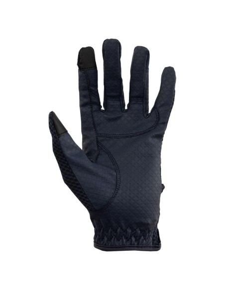 De palmzijde van de handschoenen is gemaakt van bedrukt synthetisch leer met teugelversterking voor een goede grip. Het touchscreenmateriaal op duim en wijsvinger van de zwarte en navy handschoenen zorgt ervoor dat je je telefoon kunt bedienen zonder de handschoenen uit te doen. De handschoenen zijn op de bovenzijde afgewerkt met een glitterbies en een logo-artwork van kleine strass-steentjes op het klittenband.