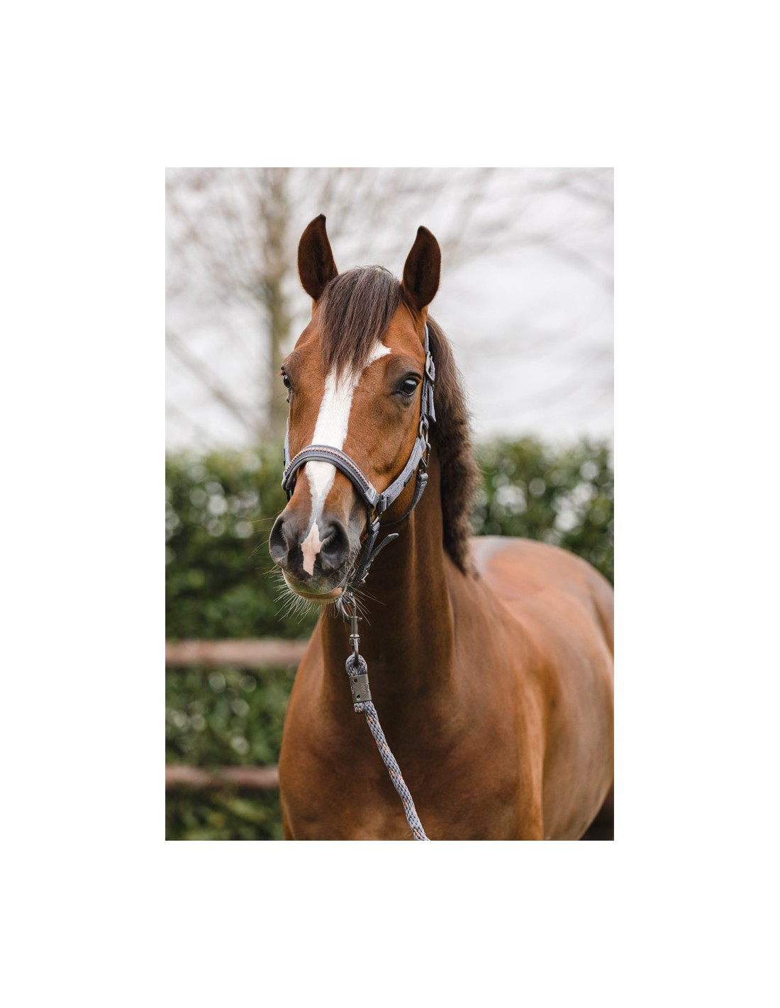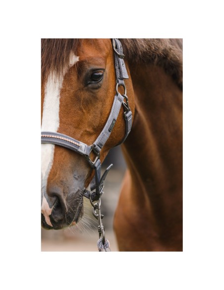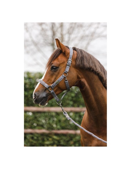 Het halster is gemaakt van polyester banden en bevat zeer sterke gespen van nikkel in een matte, donkere kleur. Het halster is verstelbaar bij het kopstuk en de neusriem voor een goede pasvorm. De keelriem kan aan één zijde losgemaakt worden om het poetsen gemakkelijker te maken.