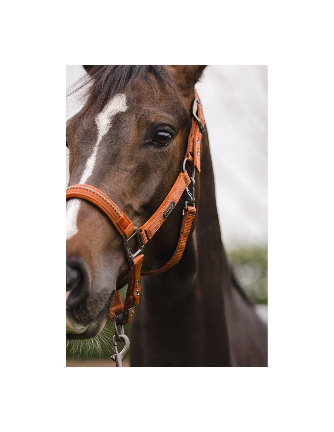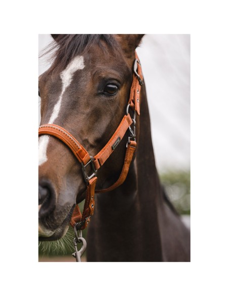 Het halster is gemaakt van polyester banden en bevat zeer sterke gespen van nikkel in een matte, donkere kleur. Het halster is verstelbaar bij het kopstuk en de neusriem voor een goede pasvorm. De keelriem kan aan één zijde losgemaakt worden om het poetsen gemakkelijker te maken.