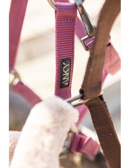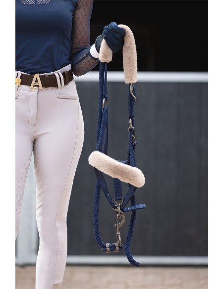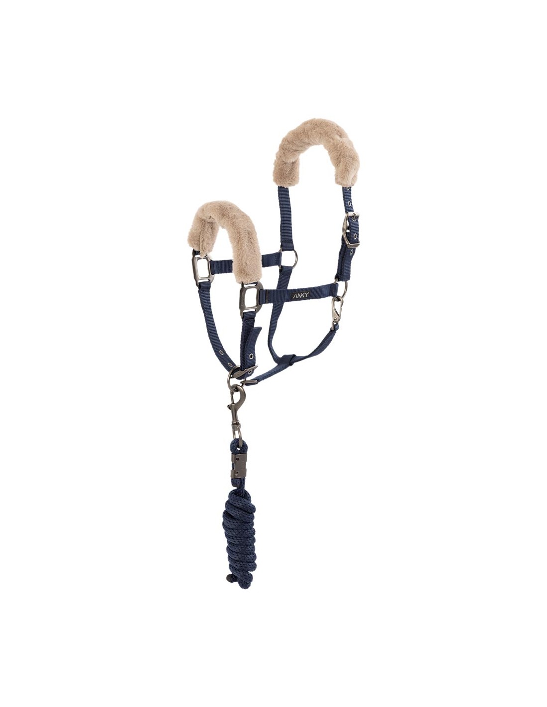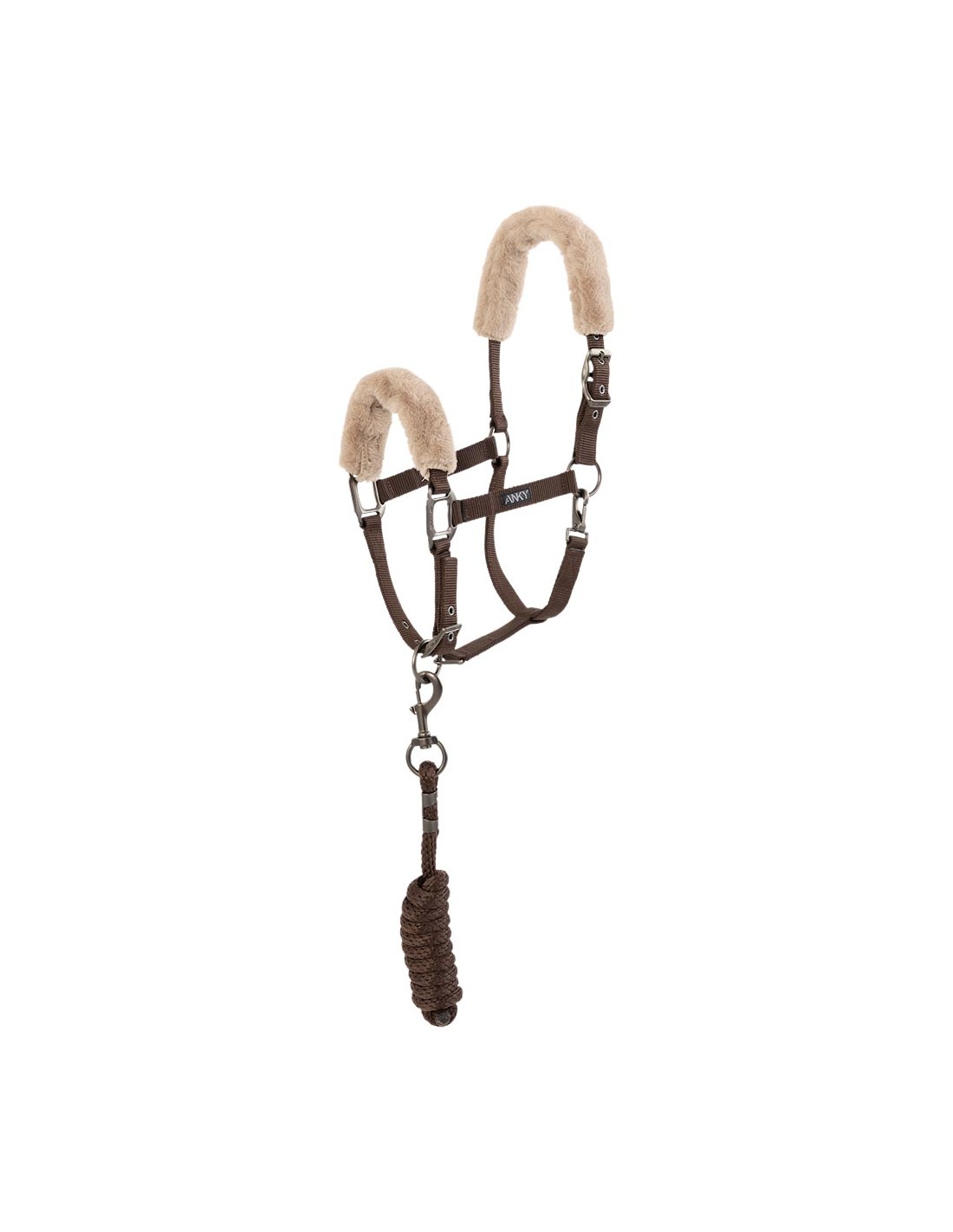 Het halster bestaat uit polyester banden die deels gevoerd zijn met enorm zacht nepbont van hoge kwaliteit (kopstuk en neusriem). De supersterke gespen zijn gunmetalkleurig voor een extra elegante uitstraling. Het halster is op meerdere plekken verstelbaar voor een perfecte pasvorm.