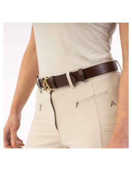 • Lichtgoudkleurige gesp met metalen logo [breedte 4 cm]